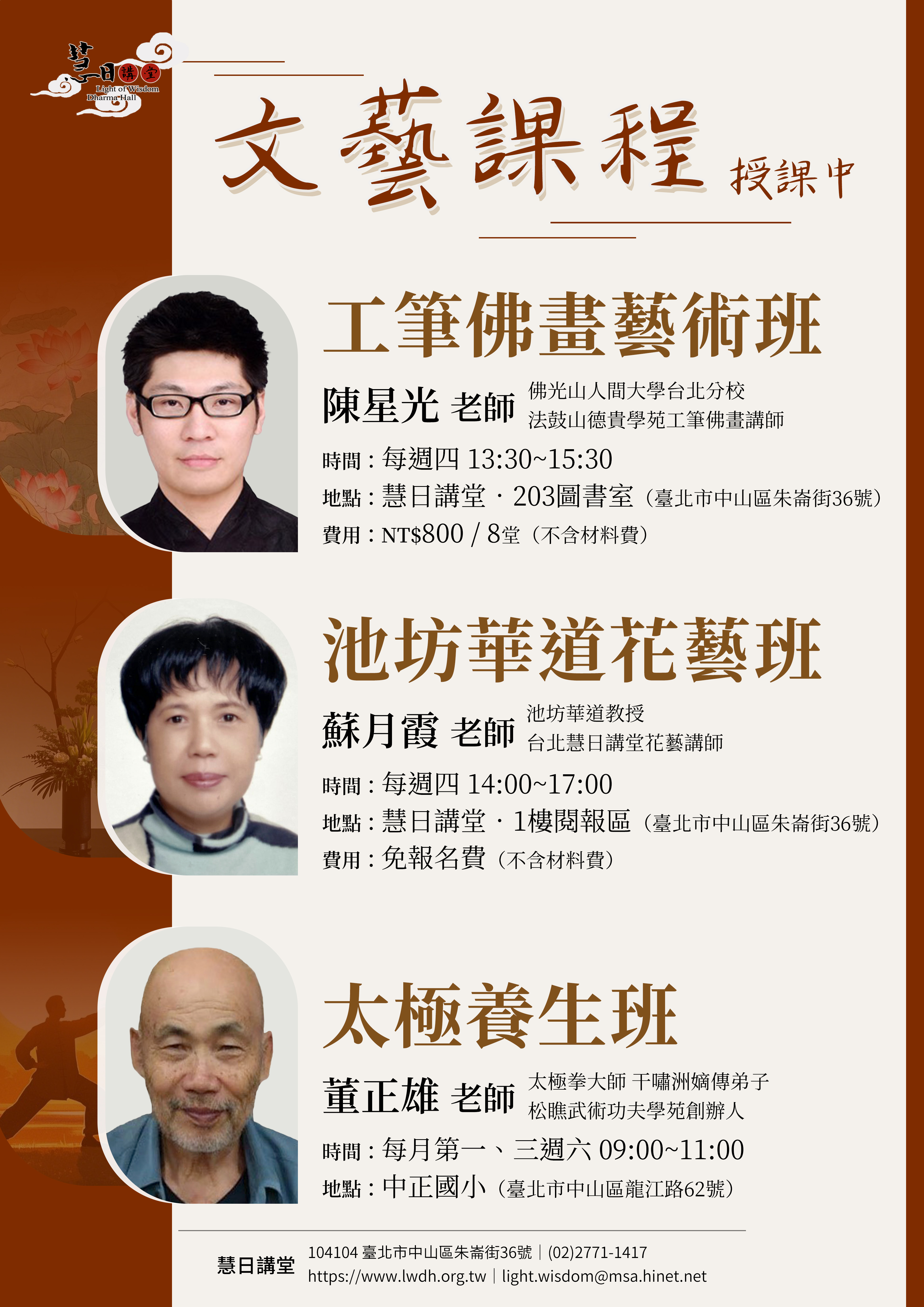 為接引並利益更多的社會大眾,慧日講堂舉辦各類佛學課程,講授佛教經論及闡揚印順導師思想,推展人間佛教。竭誠歡迎法師、居士共襄盛舉,學習正知、正見的佛法,啟發正信,進而「淨化身心、利濟人群」,向於佛道,護持正法!